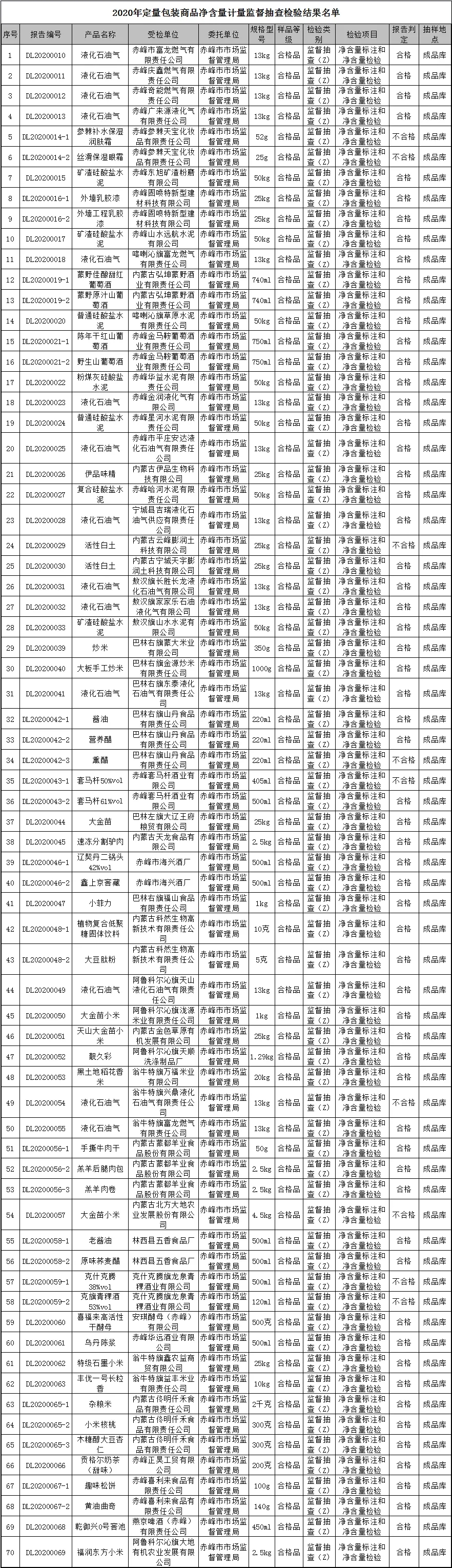 此次监督抽查由市市场监管局委托市质计所依据JJF1070-2005 《定量包装商品净含量计量检验规则》、GB175-2007《通用硅酸盐水泥》对全市各类企业的定量包装产品进行抽检。本次监督抽查的商品种类较多,包括液化石油气、水泥、活性白土、涂料、化妆品、酒类、肉制品、粮食加工、小食品、调味品等,共覆盖54家企业70批次的定量包装产品,其中61批次合格,9批次不合格,合格率为87.1%。具体抽检结果汇总表如下: