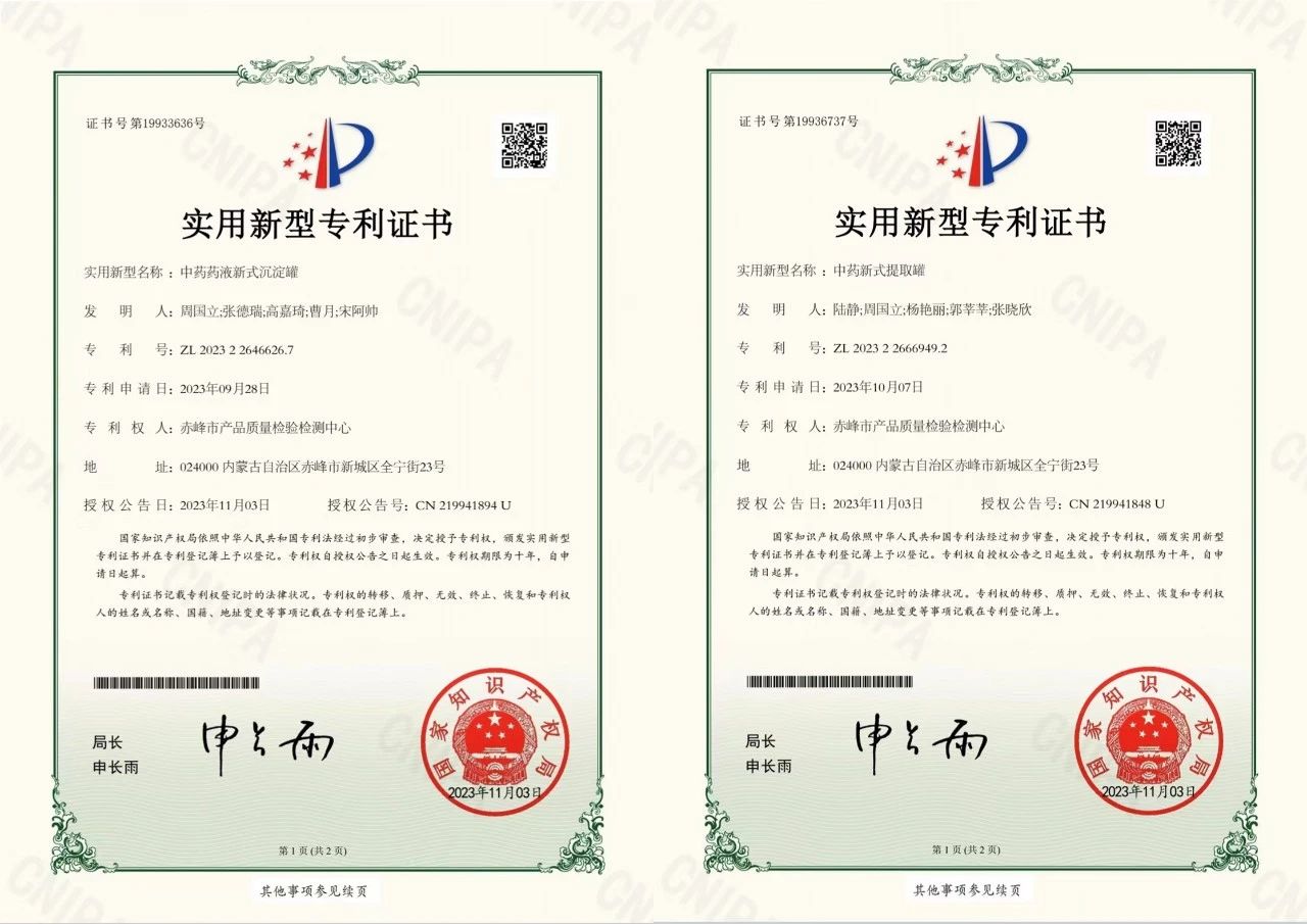 近日,由赤峰市产品质量检验检测药品检验技术人员自主研发的两项新型实用专利“中药新式提取罐”(专利号:ZL202322666949.2)和“中药药液新式沉淀罐”(专利号:ZL202322646626.7)获得国家知识产权局授权。