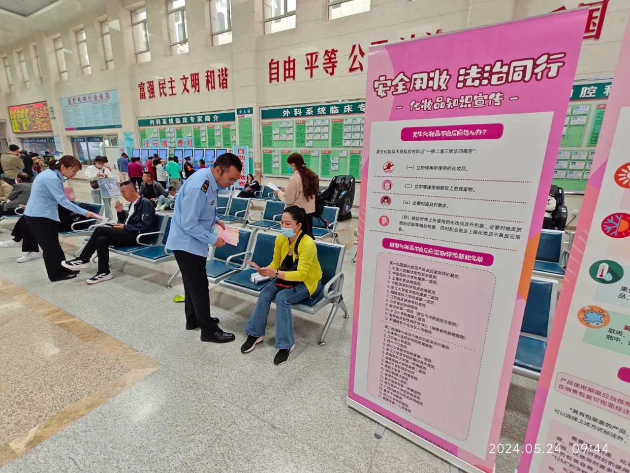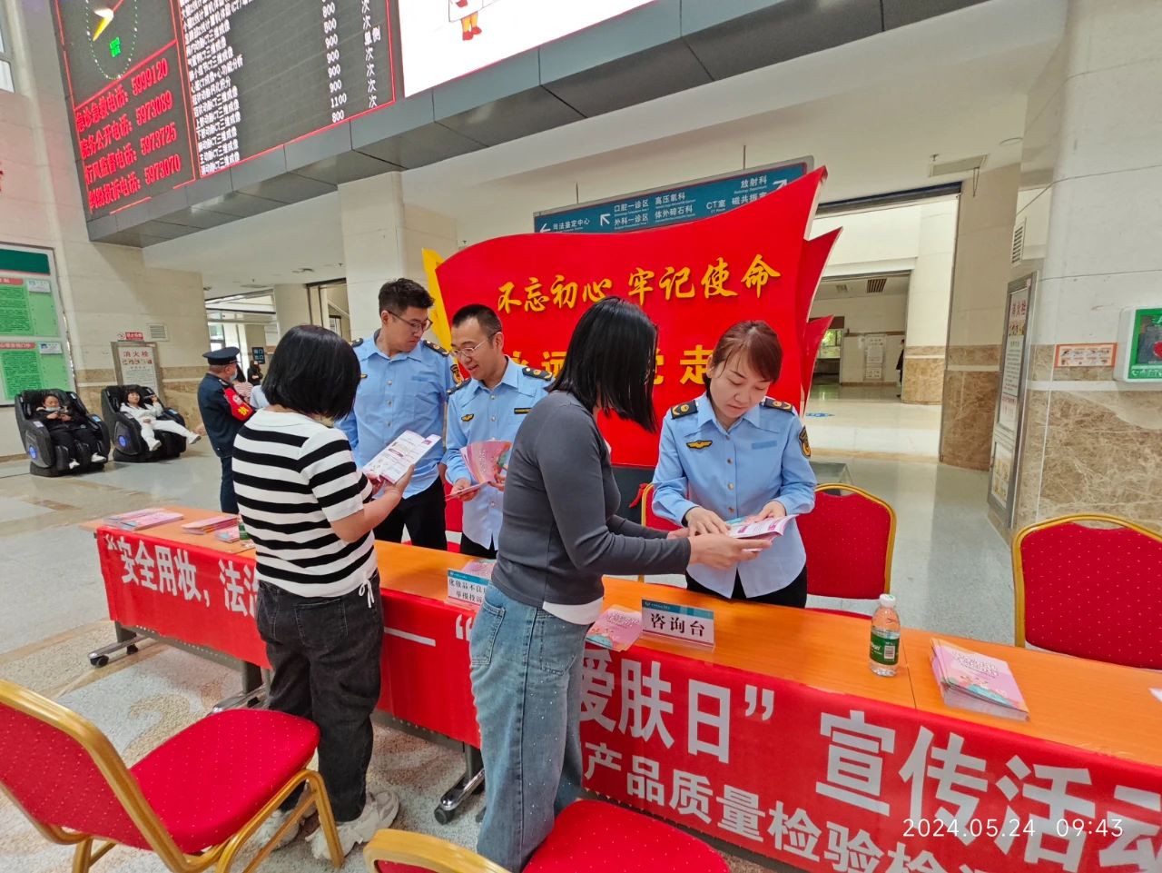 活动现场,中心监测人员重点围绕《化妆品监督管理条例》《化妆品不良反应监测管理办法》等法律法规,就如何安全用妆及选购化妆品等注意事项向候诊群众进行了科普宣讲,并在医院门诊大厅、皮肤科、口腔科等候诊区域显示屏上循环播放了2024年“5·25爱肤日”科普视频,还通过设置宣传展板、发放《化妆品知识宣传手册》、开展皮肤科义诊咨询等形式,向公众普及了化妆品安全知识以及化妆品不良反应概念,引导公众科学合理使用化妆品。活动得到了来往群众的积极参与。
