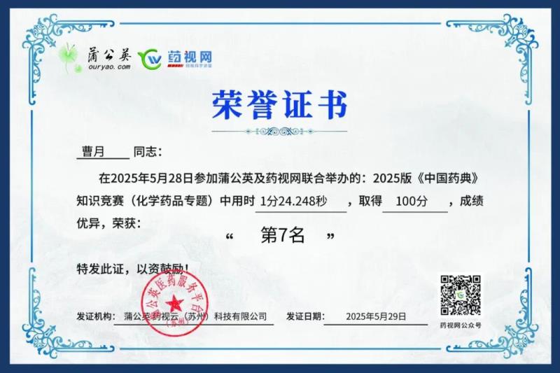 近日,在由蒲公英医药服务平台及药视网联合举办的2025版《中国药典》知识竞赛(化学药品专题)中,赤峰市产品质量检验检测中心工作人员曹月,以1分24秒的答题用时获得满分100分,从全国1700余名参赛者中脱颖而出,获得第七名的好成绩。