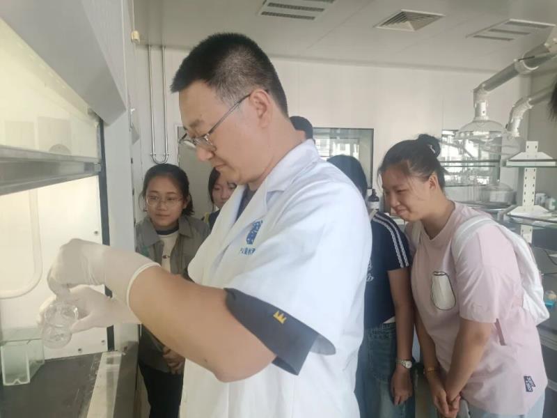 在化学实验区,学生们观看了阿司匹林的制备过程。中心工作人员对实验前准备工作以及化学反应、抽滤、洗涤、干燥等各个操作步骤进行了细致讲解与演示,使同学们切实体会到化学实验的专业性和严谨性。
